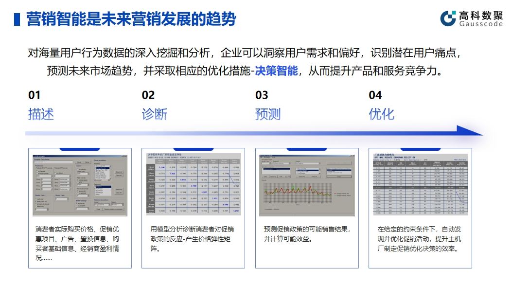 营销智能是数智化开展的趋势,顺利获得深入挖掘和分析海量的用户行为数据,企业能够洞察用户需求和偏好,识别潜在用户痛点,并利用数智化平台优化决策方式和预测市场趋势,并基于数据结果采取相应的优化措施,即决策智能。这一过程有助于提升产品和服务的竞争力,使企业更好地适应市场变化,给予满足客户需求的创新解决方案。