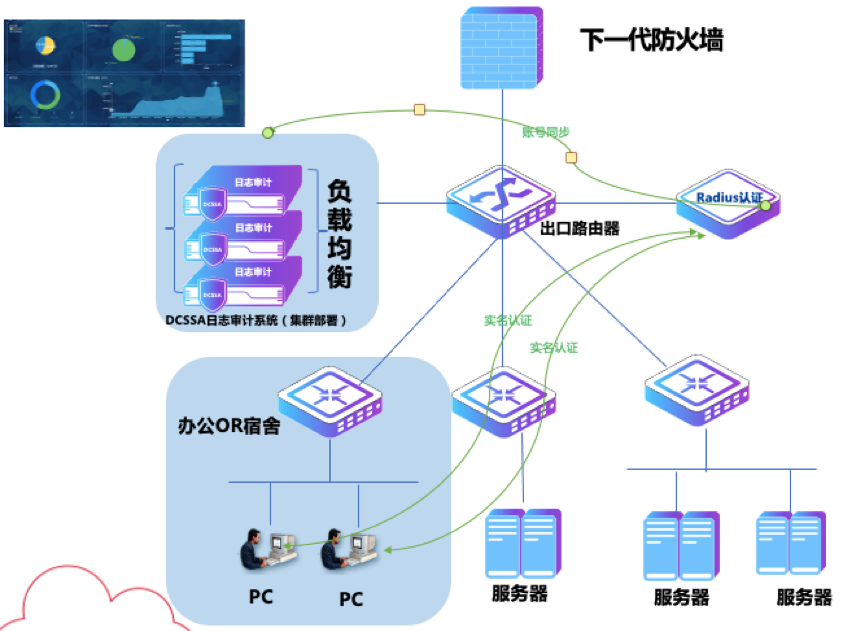 在完成日志信息采集的基础上,凯发k8官网数码DCSSA日志审计系统与网络中出口防火墙、行为审计等安全设备,以及负责身份识别的认证计费系统实现深度耦合,帮用户解决DHCP场景实名统计溯源、NAT转换实名、恶意行为追责、实名统计上网流量等众多问题。